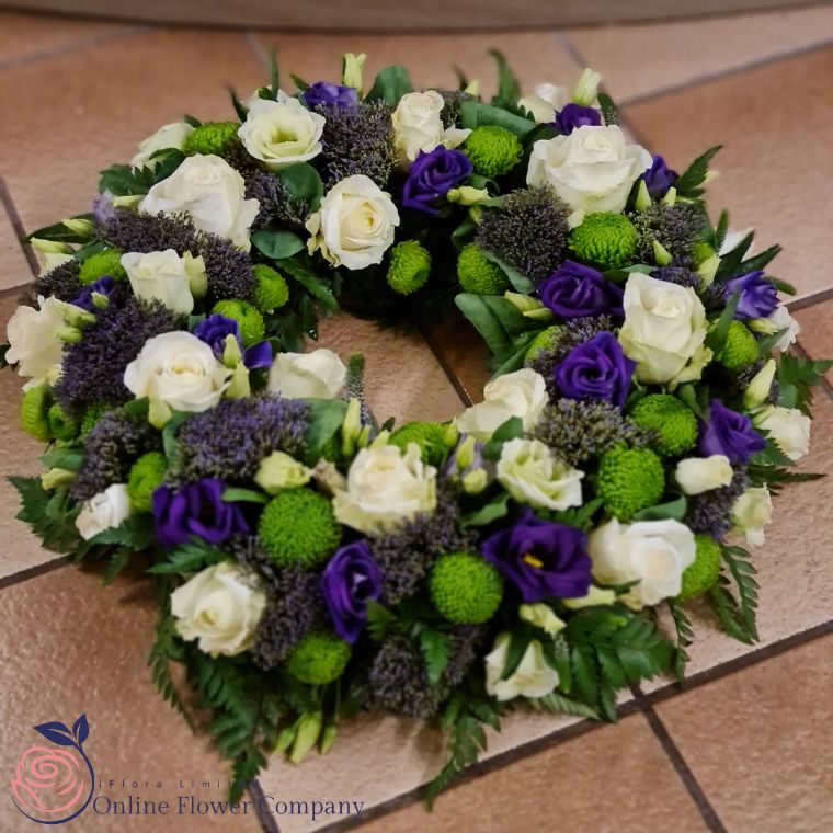 This elegant White Fresh Flower Funeral Wreaths is a classic and serene tribute. It features a beautiful arrangement of White Roses, symbolizing purity and innocence, and delicate Chrysanthemums, representing sympathy and grief. The addition of vibrant Purple Irises adds a touch of color and symbolizes wisdom and hope.