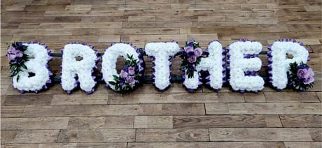 This heartfelt Brother Flowers for Funeral tribute is a touching way to honor the memory of a beloved brother. It features a beautiful floral arrangement spelling out “Brother,” crafted with pristine White Chrysanthemums, symbolizing purity and everlasting love. Purple Roses and delicate fillers accent the tribute, conveying admiration, respect, remembrance, elegance, and texture.