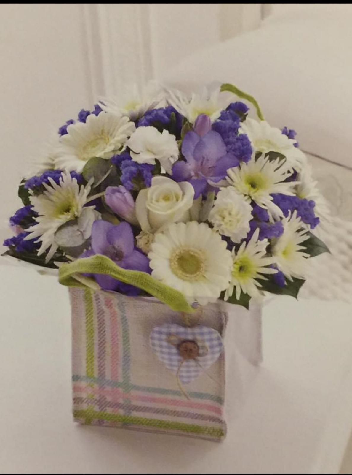 Our Flowers in a Gift Box is an elegant and thoughtful floral arrangement, perfect for various occasions such as birthdays, anniversaries, Mother’s Day, and more. This delightful bouquet includes a harmonious blend of white Gerbera Daisies, white Roses, yellow Chrysanthemums, purple Lisianthus, purple Statice, and assorted small colorful flowers, ensuring a bright and cheerful presentation. The flowers are expertly arranged in a bag, complemented with lush greenery and fillers for a full, vibrant look.