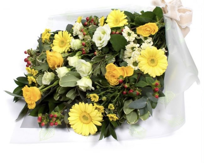 This hand-tied tribute offers a peaceful way to honor a loved one. Our florists use bright yellow roses and gerberas to show respect. These fresh stems bring a sense of calm to any memorial service. Each arrangement looks classic and elegant. It helps friends and family express their deepest sympathy during difficult times.